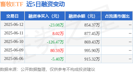 本站消息,6月12日,畜牧ETF(159867)融资买入49.98万元,融资偿还73.06万元,融资净卖出23.08万元,融资余额854.37万元,近20个交易日中有11个交易日出现融资净买入。